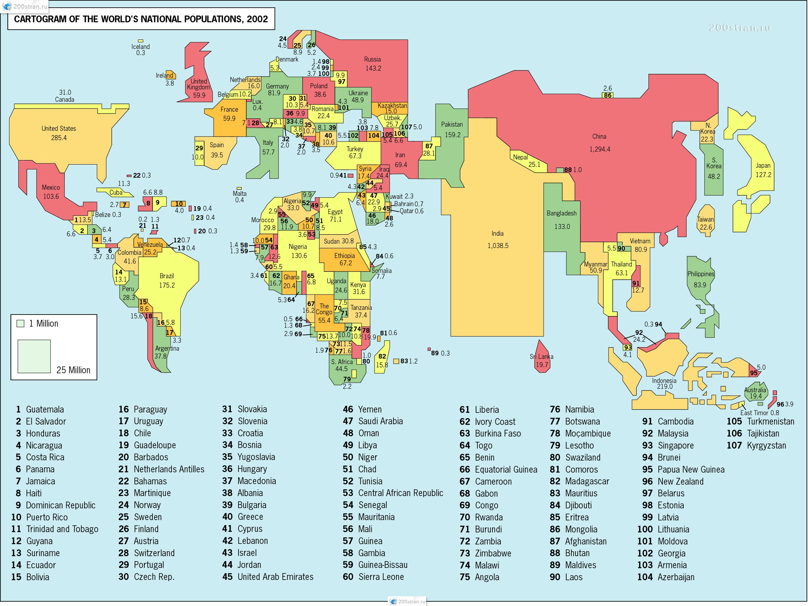 /   Экономические карты мира   /   Картограмма плотности населения мира