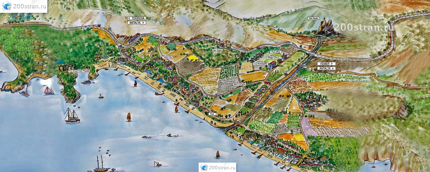 Карта средизимноморского побережья Турции от Анталии до Кемера