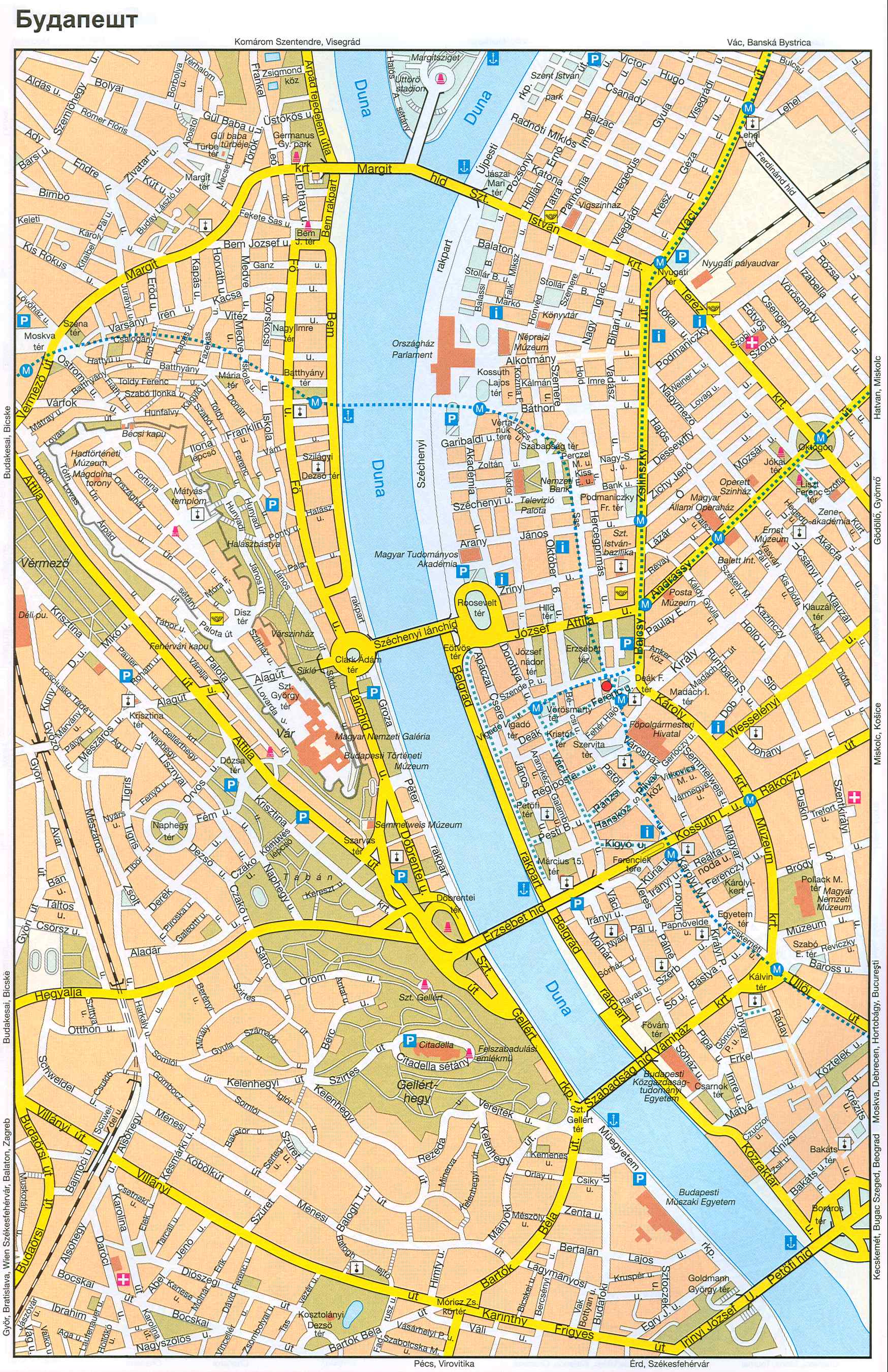 Отличная очень подробная карта Будапешта с посольствами, банкоматами, больницами и прочим