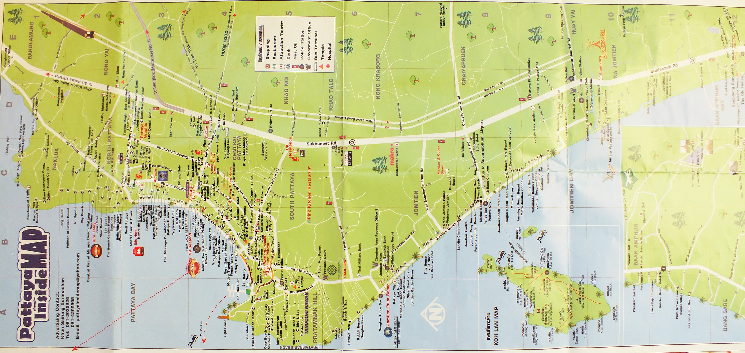 Карта Паттайи на русском - отмечены два основных госпиталя для туристов Pattaya International Hospital и Pattaya Memorial Hospital, все крупный молы Tesco Lotus и Big C, а также магазины seven eleven