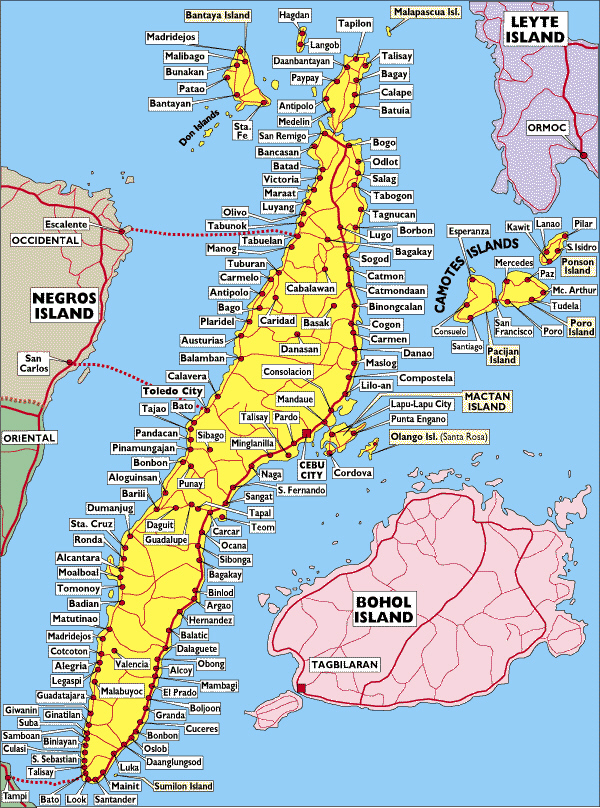 Карта острова Себу со всеми населенными пунктами | Map of Cebu with all the settlements
