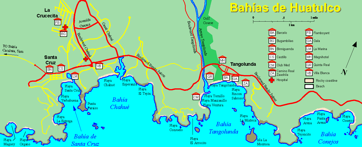 Карта курортных зон Хуатулько и Ла Круцесито с отелями