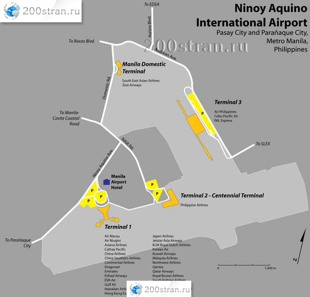 Карта расположения всех четырех терминалов аэропорта Манилы с указанием авиакомпаний | Location map of the four airport terminals Manila showing flights