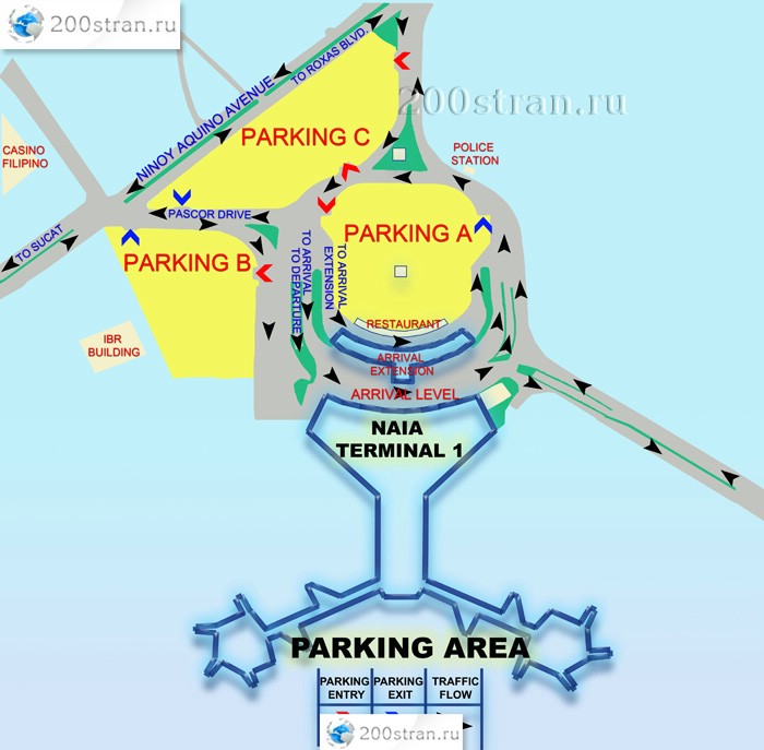 Расположение парковок около терминала 1 аэропорта Манилы | The location of parking lots near the Terminal 1 airport Manila