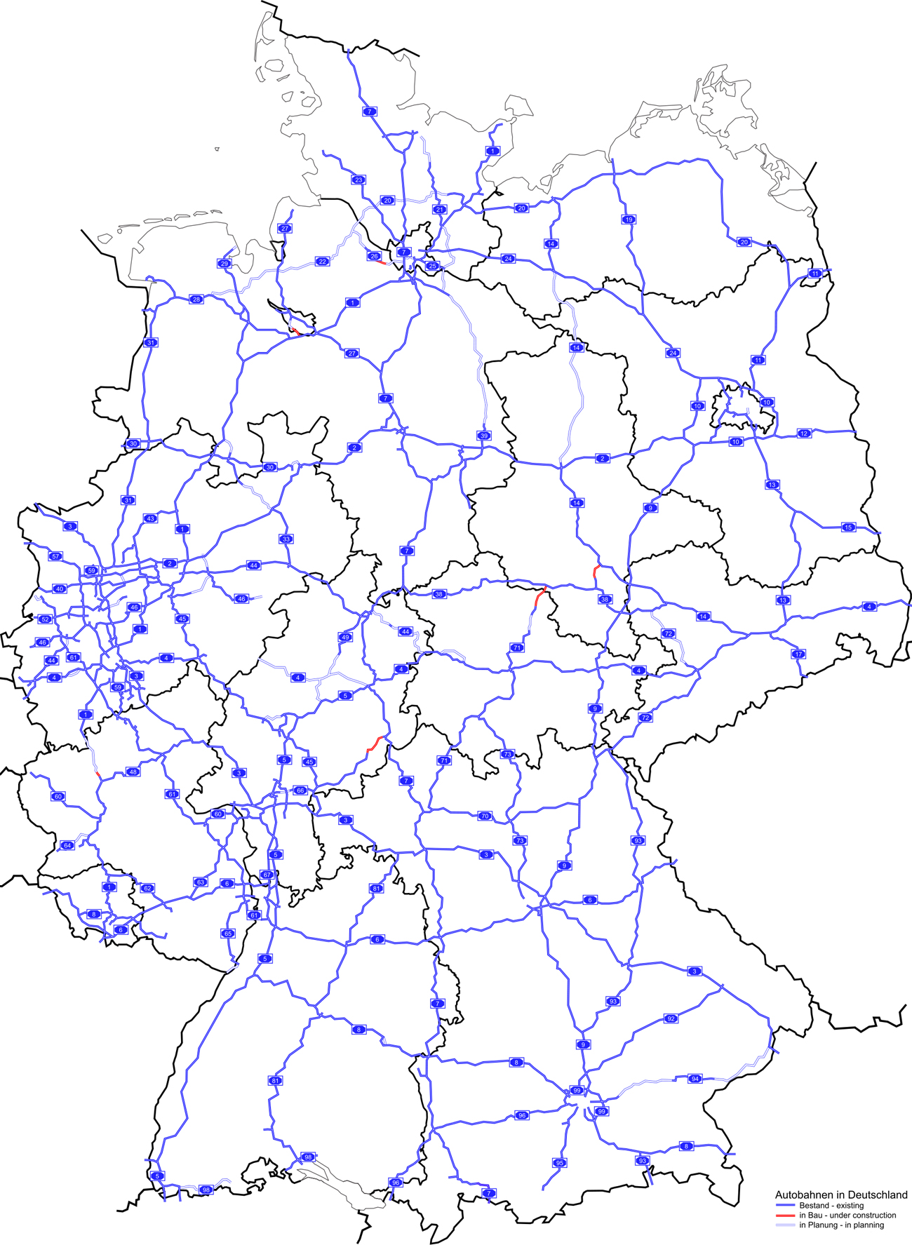 Карта автомобильных дорог Германии с европейскими и немецкими номерами дорог