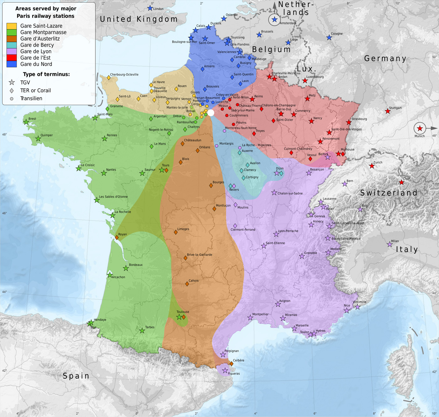 Направления движения поездов со всех семи вокзалов Парижа (с какого вокзала куда можно доехать)