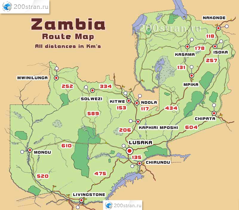 Карта Замбии с расстояниями между городами | Map of Zambia with the distances between cities