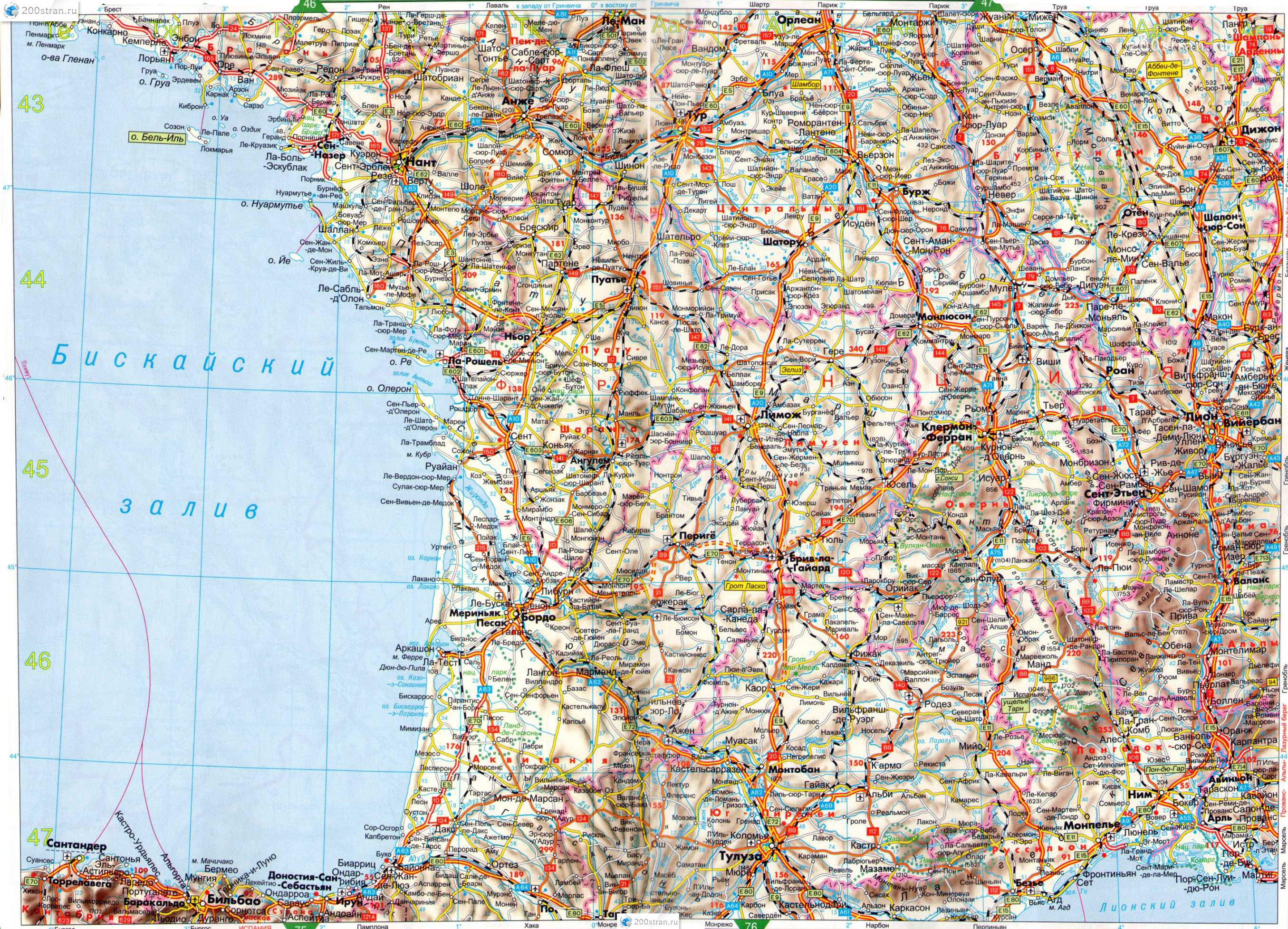 Карта автомобильных дорог Юга Франции. Побережье Бискайского залива.