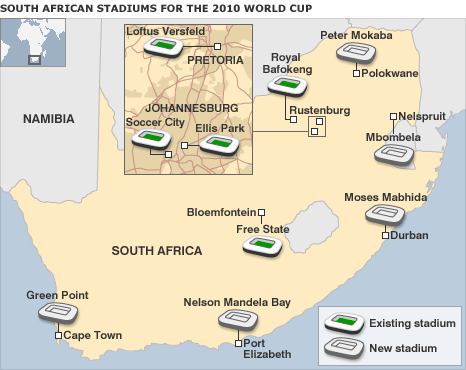 Карта расположения стадионов Чемпионата мира 2010 в ЮАР по футболу