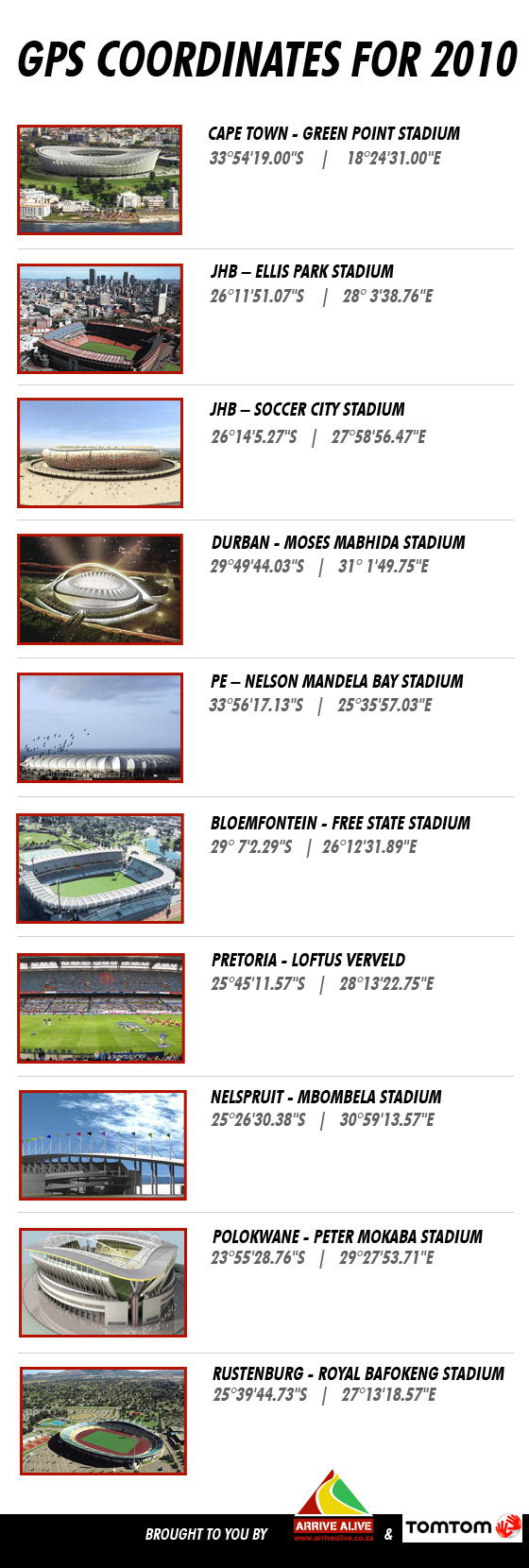 GPS координаты стадионов Чемпионата мира по футболу 2010 в ЮАР | GPS coordinates stadiums FIFA World Cup 2010 in South Africa