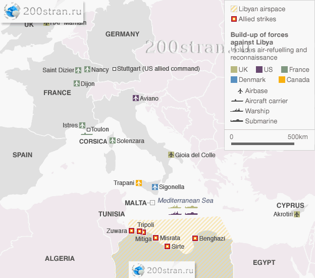 Карта авиаударов по Ливии (объекты и аэродромы с которых совершаются вылеты)