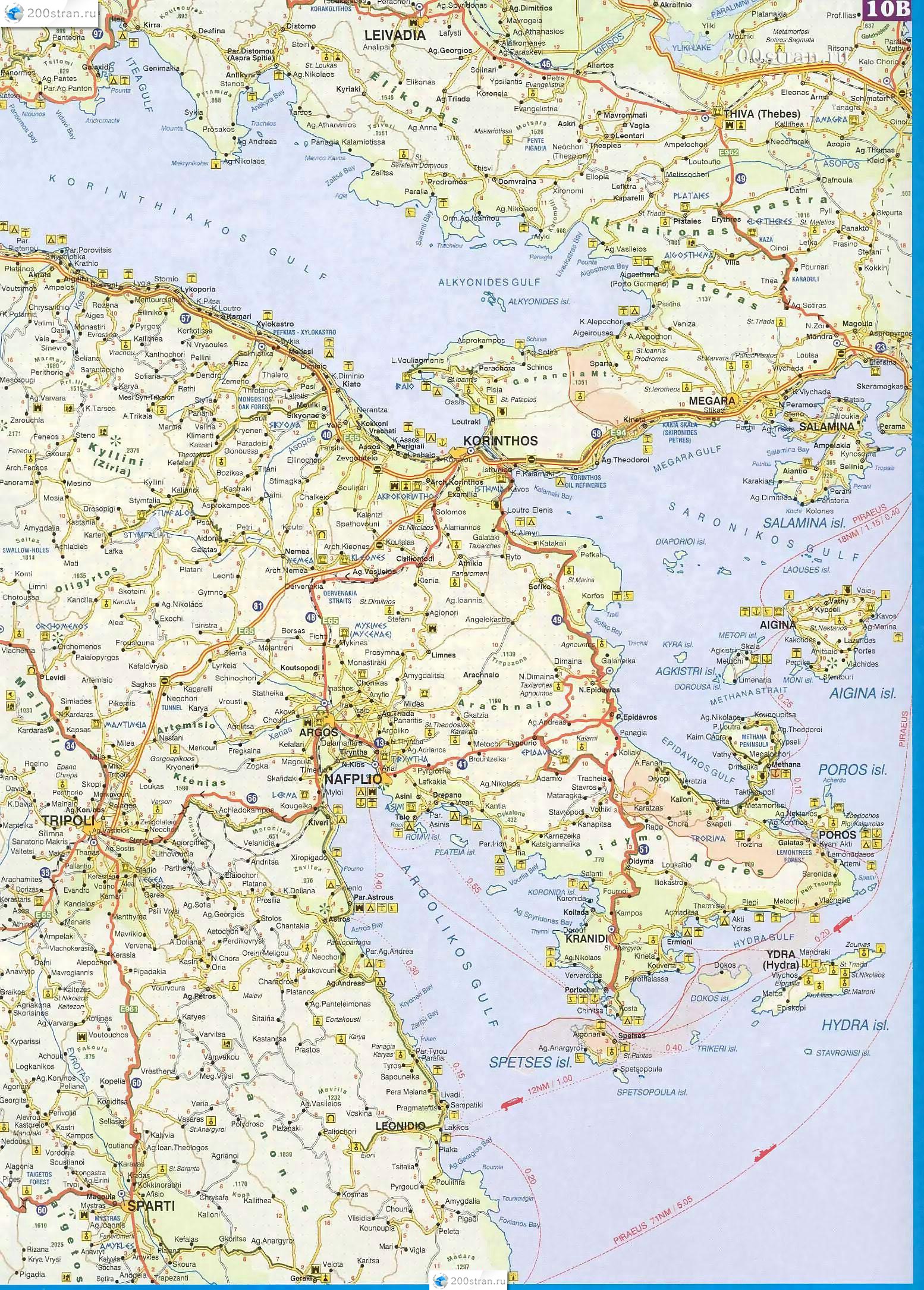 Карта востока полуострова Пелопоннес (Peloponnese), Триполи, Коринф, Спарта, Краниди