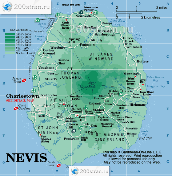 Карта Сент-Китс и Невис (остров Невис) | Map of Saint Kitts and Nevis (island of Nevis)